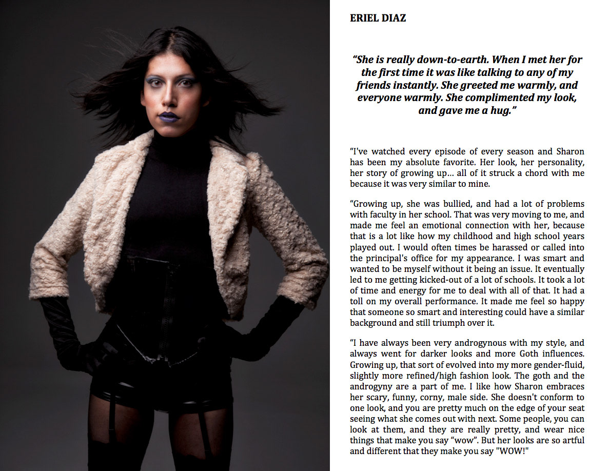 Fast-forward several months, and I find myself at the Dream Downtown, a hotel in Chelsea, photographing Ms. Needles, "America's next drag superstar." She had indeed won Drag Race, and I can say with complete honesty that my devotion to the show in general, and to her effort specifically, had not once lagged. The day we first met in person, I was about halfway through an enormous editorial assignment for Out magazine, making portraits of the 100 most interesting and influential LGBT persons of the year. The assignment had me photographing such legends as Sir Elton John, Boy George and David Hockney, but it was this shoot that made me the most nervous. Sharon's razor-sharp wit and her ability to level withering remarks had me sweating. On top of it, we were all hoping to leave the shoot with a possible cover, so my team and I were pushing extra hard. (In the end, we did get that cover, and I believe that it turned out to be the most popular of the four we made for the special issue.)
